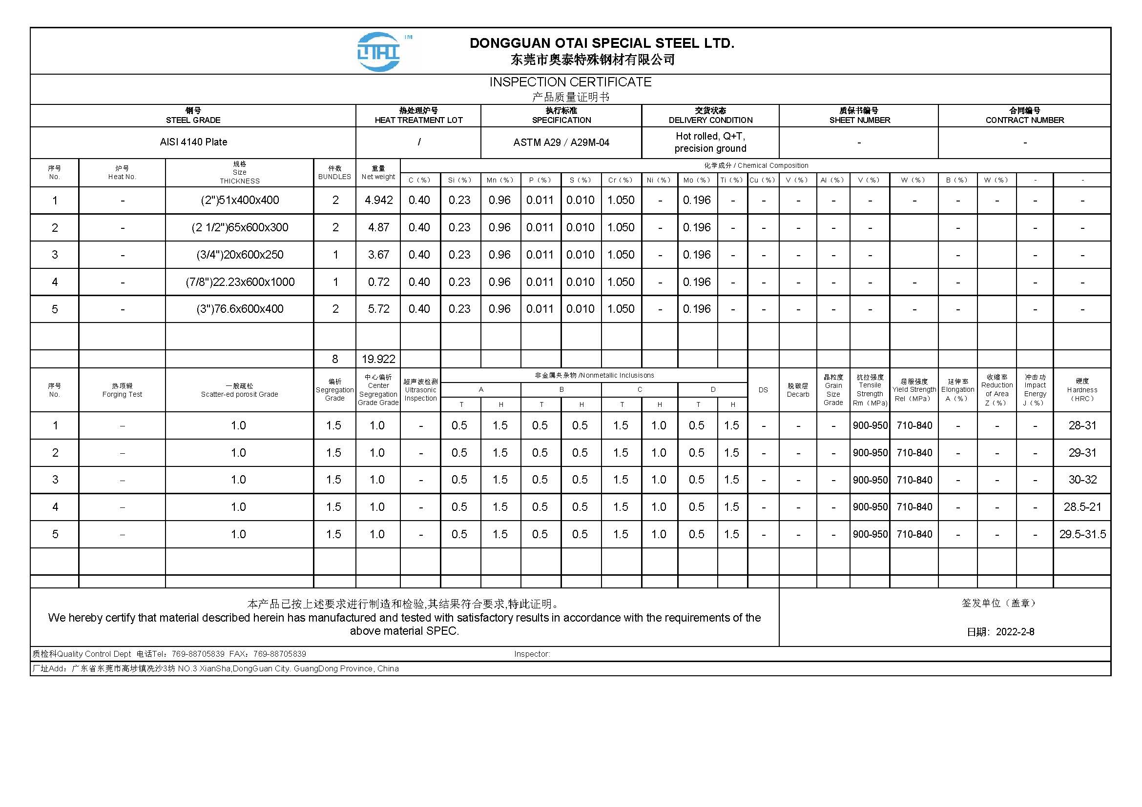 Otai es uno de los principales proveedores de placas de acero 4140. Suministramos varios espesores de placa 4140 y planos o fresados 4140 planos y bloques. Mantenemos más de 1000 toneladas de inventario de placas de acero 4140 para un envío rápido.